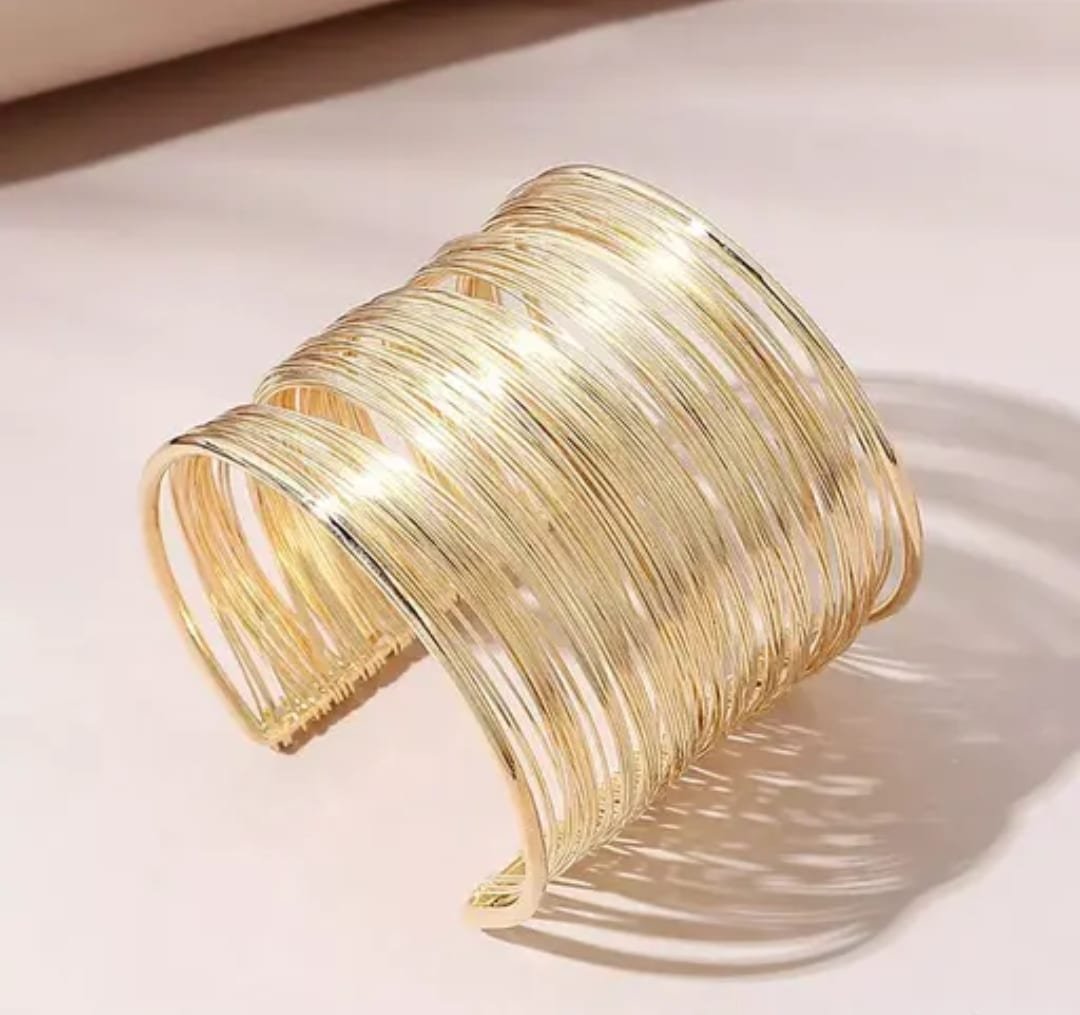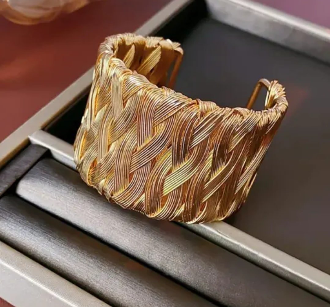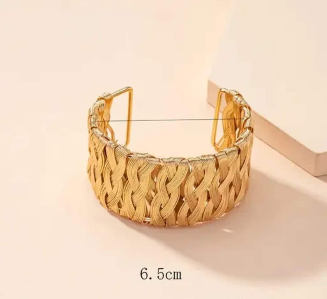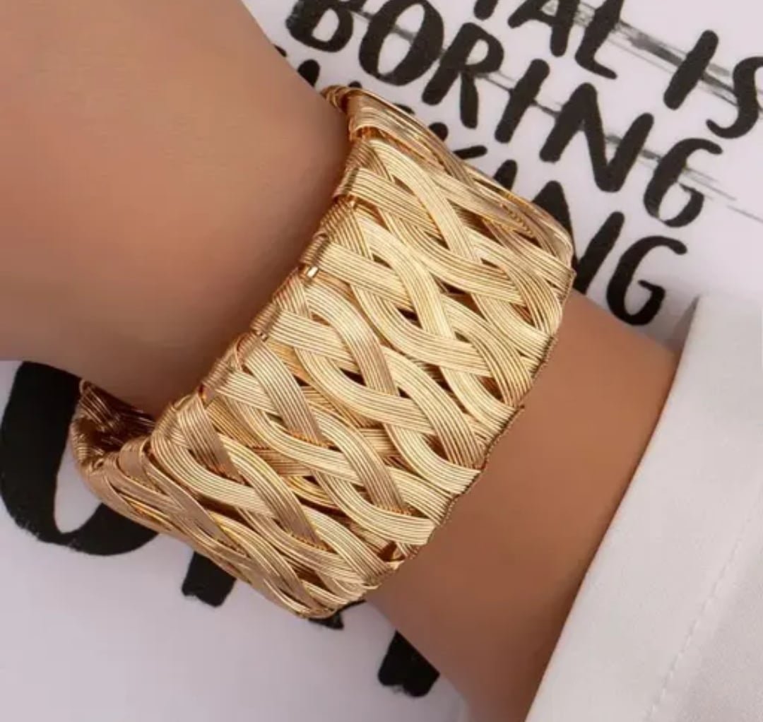 Elevate your style with our exquisite Golden Wide Cuff Bracelet. Crafted with precision and grace, this stunning accessory features an intricate design of delicately woven gold strands, seamlessly blending boldness with sophistication. Brilliantly engineered to add a touch of luxury to any ensemble, this bracelet is an incomparable statement piece for the modern elegant woman. Measuring [insert size], it provides a comfortable and secure fit while reflecting a timeless allure. Ideal for both everyday wear and special occasions, this gold cuff bracelet is a must-have addition to your jewelry collection.